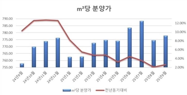 분양평가 전문회사 리얼하우스가 13일 한국부동산원 청약홈 자료를 분석한 결과, 지난 9월 전용면적당 민간 아파트 전국 평균 분양가는 약 778만원으로 집계됐다. 이는 전월 대비 0.43%, 전년 동기 대비 2.65% 상승한 수치다.