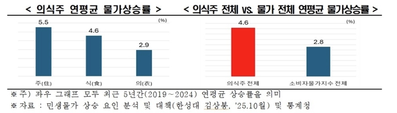 한국경제인협회가 16일 김상봉 한성대학교 교수에게 의뢰해 발표한 '민생물가 상승 요인 분석 및 대책' 보고서에 따르면, 2019년부터 2024년까지 의식주 물가는 연평균 4.6% 상승했다. 이는 같은 기간 전체 소비자물가 상승률 2.8%보다 1.8%포인트 높은 수치다.