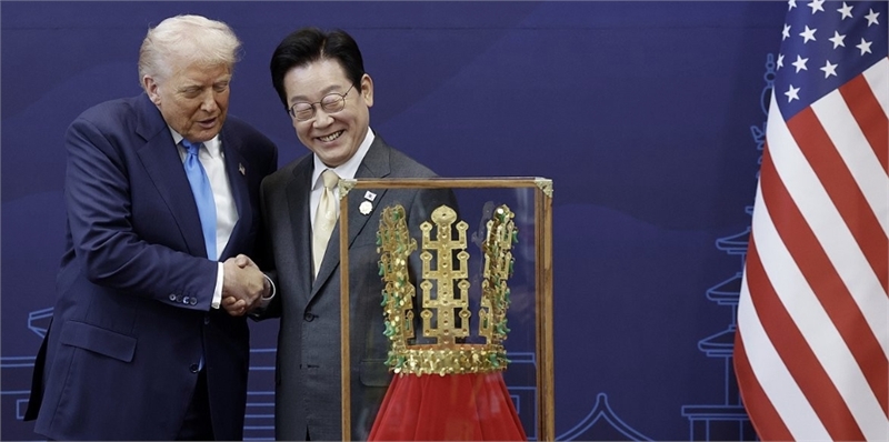 트럼프 대통령은 이재명 대통령이 선물한 신라 금관 모형에 특히 각별한 관심을 보였다. 김 대변인은 "트럼프 대통령이 선물에 각별히 기뻐하는 모습을 보였다"며 "트럼프 대통령이 전용기인 에어포스원에 직접 싣고 가겠다고 해서 그게 가능한지 우리 측에 급하게 요청하기도 했다"고 밝혔다.