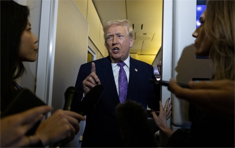 워싱턴DC로 향하는 전용기서 기자들과 이야기하는 트럼프 미국 대통령 [자료사진=연합뉴스]